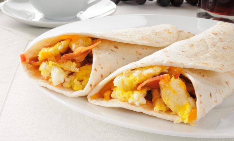 Для приготовления буррито с беконом и яйцом вам понадобятся следующие ингредиенты: тортилья, яйца, бекон, сыр чеддер, помидоры, лук, авокадо, соль, перец, оливковое масло.